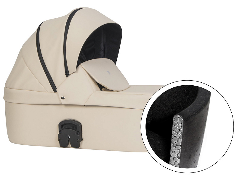 инновационная особенность модели - ультралегкая термолюлька, выполненная из материала Piocelan. Этот наноматериал - нетоксичный, легкий, высокопрочный, противоударный. Но главное, такая люлька поддерживает температуру и защищает кроху от громких звуков. Морозной зимой в люльке будет тепло и сухо, а в летний зной - прохладно.