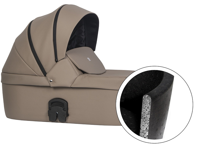 инновационная особенность модели - ультралегкая термолюлька, выполненная из материала Piocelan. Этот наноматериал - нетоксичный, легкий, высокопрочный, противоударный. Но главное, такая люлька поддерживает температуру и защищает кроху от громких звуков. Морозной зимой в люльке будет тепло и сухо, а в летний зной - прохладно.