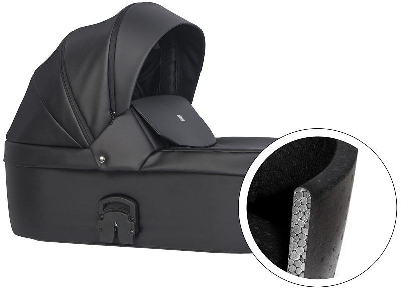 инновационная особенность модели - ультралегкая термолюлька, выполненная из материала Piocelan. Этот наноматериал - нетоксичный, легкий, высокопрочный, противоударный. Но главное, такая люлька поддерживает температуру и защищает кроху от громких звуков. Морозной зимой в люльке будет тепло и сухо, а в летний зной - прохладно.