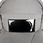 - Капор имеет жёсткое крепление к люльке, на нём находится ручка для переноски люльки, в раскрытом положении он фиксируется, для сложения необходимо нажать кнопки с двух сторон. В капор встроена антимоскитная сетка и дополнительный козырёк для защиты от солнца и дождя