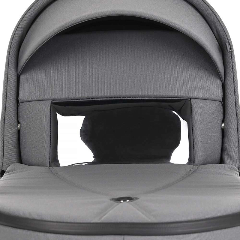 - Капор имеет жёсткое крепление к люльке, на нём находится ручка для переноски люльки, в раскрытом положении он фиксируется, для сложения необходимо нажать кнопки с двух сторон. В капор встроена антимоскитная сетка и дополнительный козырёк для защиты от солнца и дождя