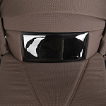 - Капор имеет жёсткое крепление к люльке, на нём находится ручка для переноски люльки, в раскрытом положении он фиксируется, для сложения необходимо нажать кнопки с двух сторон. В капор встроена антимоскитная сетка и дополнительный козырёк для защиты от солнца и дождя