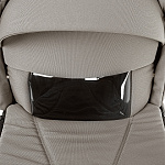 - Капор имеет жёсткое крепление к люльке, на нём находится ручка для переноски люльки, в раскрытом положении он фиксируется, для сложения необходимо нажать кнопки с двух сторон. В капор встроена антимоскитная сетка и дополнительный козырёк для защиты от солнца и дождя