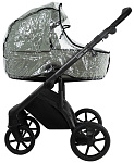 Накидка на люльку имеет дополнительный отворот со смотровым окном, сам отворот полностью закрывает ребенка от непогоды и крепится за счёт магнитов.
