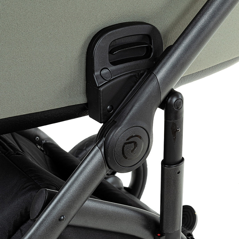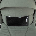 - Капор имеет жёсткое крепление к люльке, на нём находится ручка для переноски люльки, в раскрытом положении он фиксируется, для сложения необходимо нажать кнопки с двух сторон. В капор встроена антимоскитная сетка и дополнительный козырёк для защиты от солнца и дождя