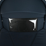 - Капор имеет жёсткое крепление к люльке, на нём находится ручка для переноски люльки, в раскрытом положении он фиксируется, для сложения необходимо нажать кнопки с двух сторон. В капор встроена антимоскитная сетка и дополнительный козырёк для защиты от солнца и дождя