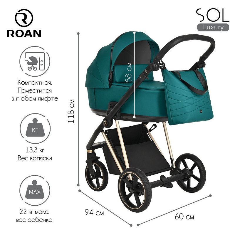 Детская коляска Roan Sol Luxury 3 в 1 с автокреслом Tutis Elo Black RSL/4045 Deep Lake/GoldНет оценокХарактеристики