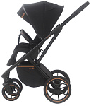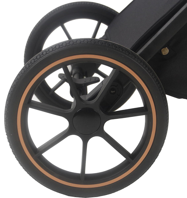 Коляска имеет алюминиевую раму с родительской ручкой, обшитой кожей. Бескамерные резиновые колеса хорошо амортизируются и не боятся острых предметов на дороге. Передние колеса поворотные с блокировкой, а задние колеса имеют увеличенный диаметр для повышенной проходимости.