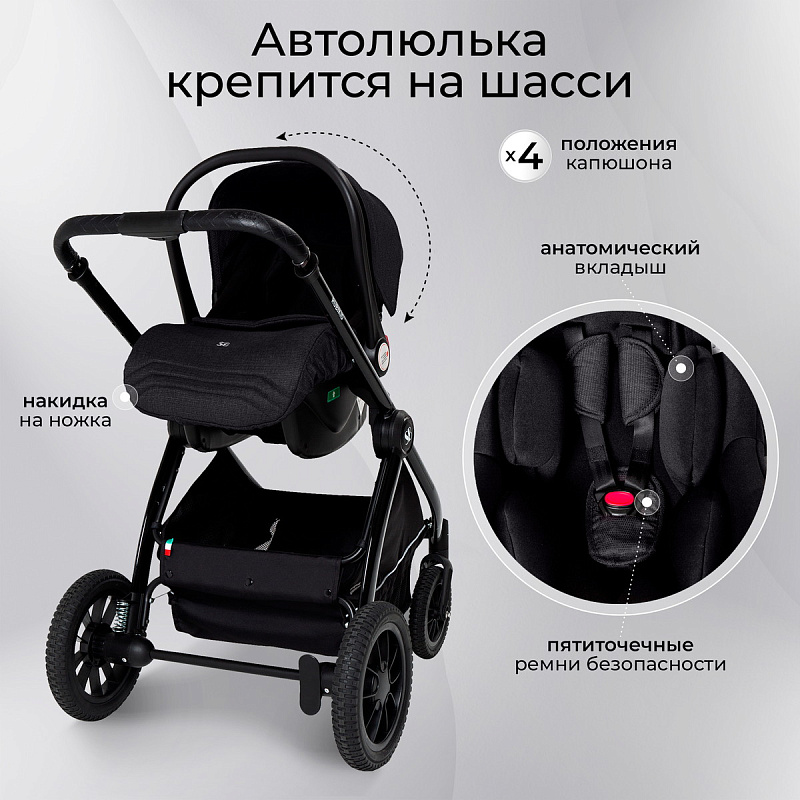 Легкое соединение: Автокресло можно быстро и удобно закрепить на шасси коляски, что обеспечивает простоту в использовании.