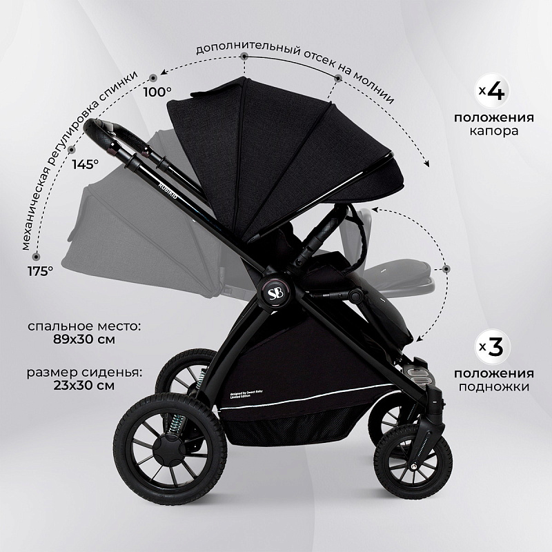 - Удобная регулировка: Механическая регулировка спинки в трех положениях позволяет легко адаптировать коляску под настроение и потребности малыша