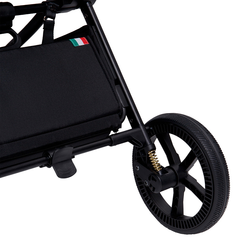 Большие не надувные колёса с амортизаторами обеспечивают плавность хода и хорошую проходимость на разных поверхностях.