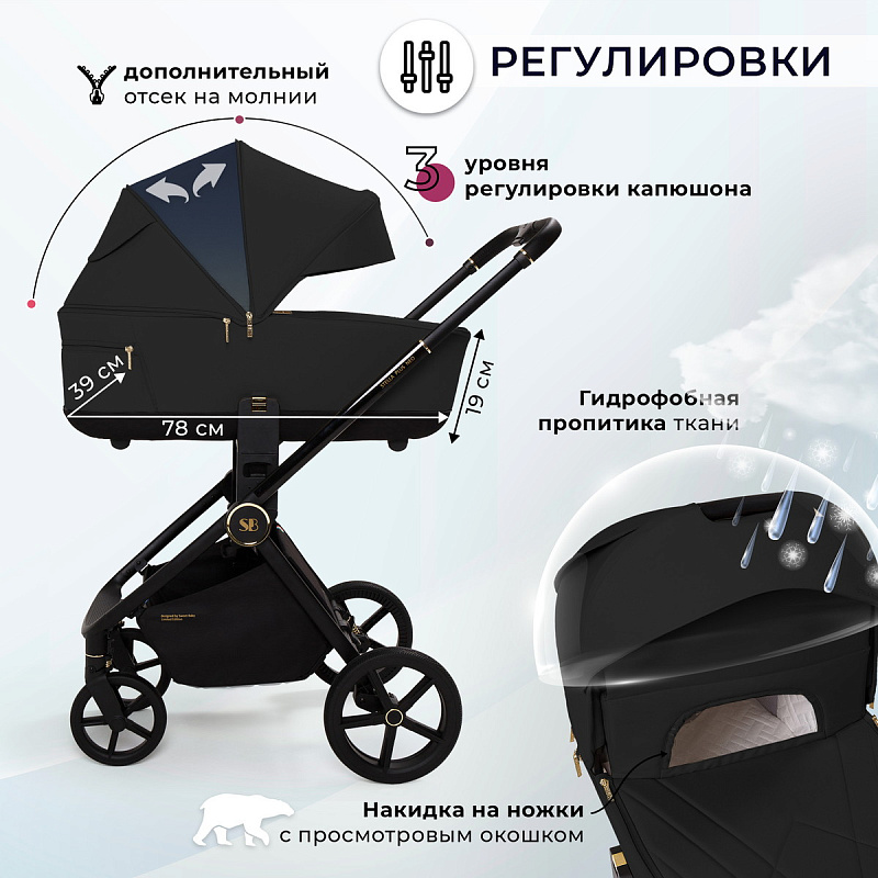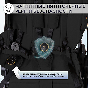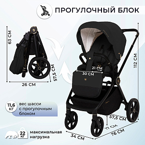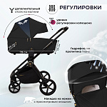 Прогулочный блок: капор с двумя молниями, регулировка спинки, пятиточечные ремни безопасности, бампер из эко-кожи.