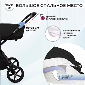 Просторная люлька: размер 78х39 см, анатомический матрасик, регулировка капюшона и козырёк для защиты от солнца, дождя и ветра.