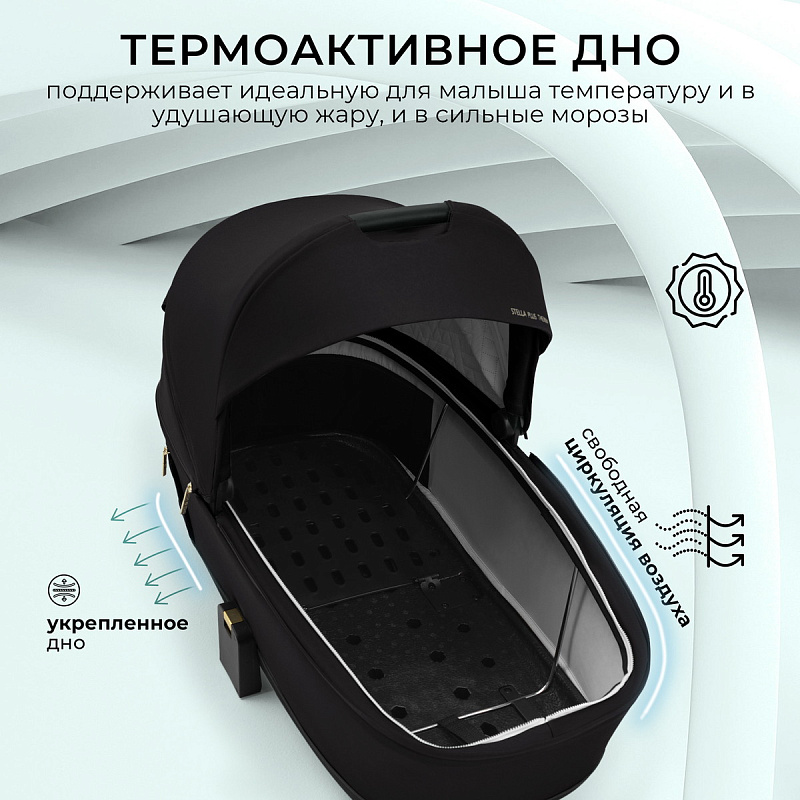 - Термоактивное дно люльки — это не просто фишка, это ваша гарантия, что малыш всегда будет в тепле и уюте. При любых погодных условиях люлька поддерживает оптимальную циркуляцию воздуха и температуры, исключая возникновение влажности.
