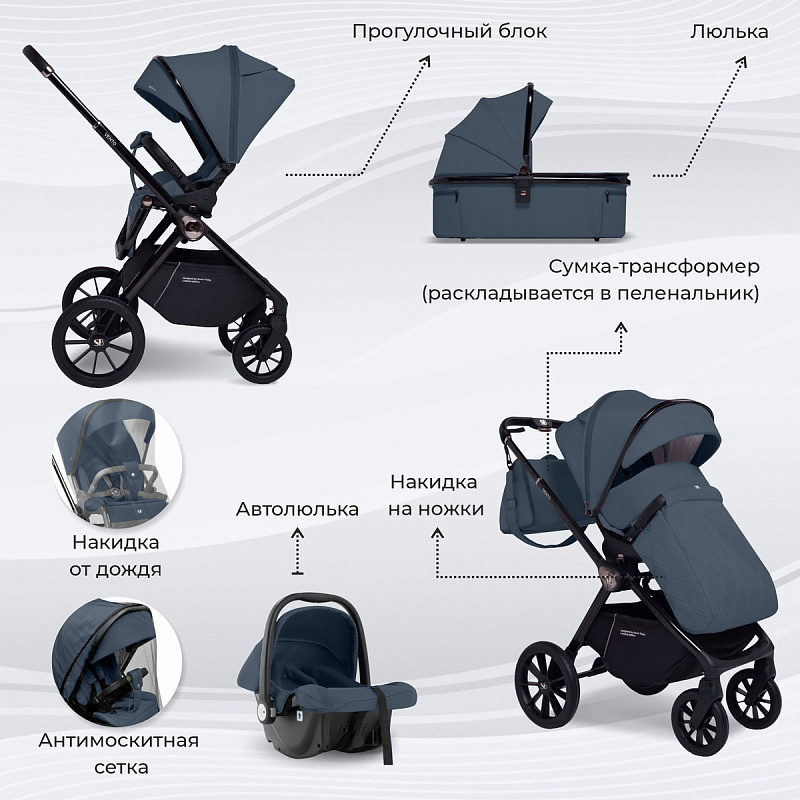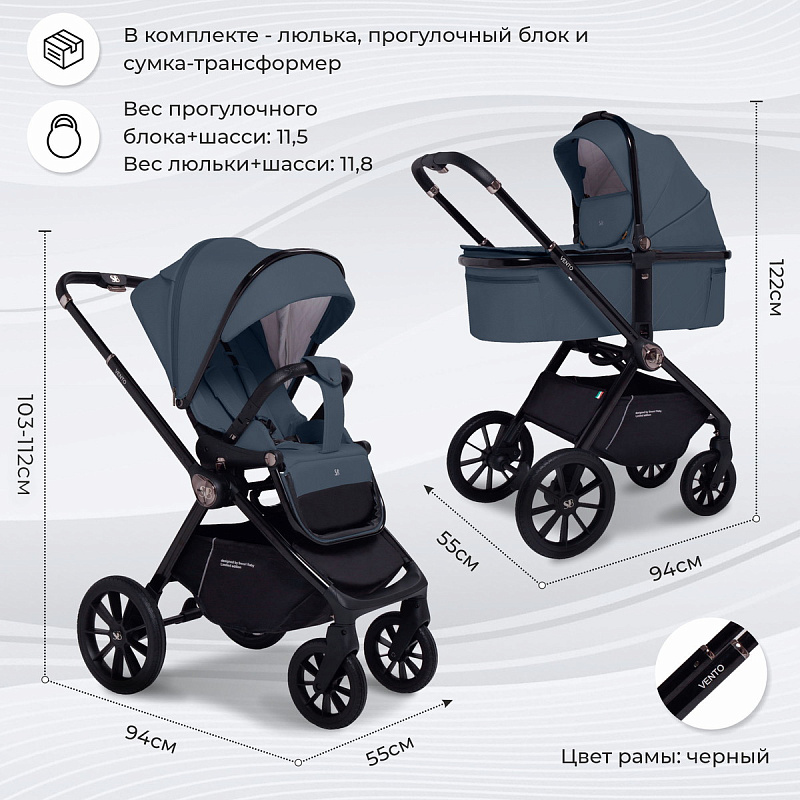 Детская коляска Sweet Baby Vento Black 3 в 1 Blue