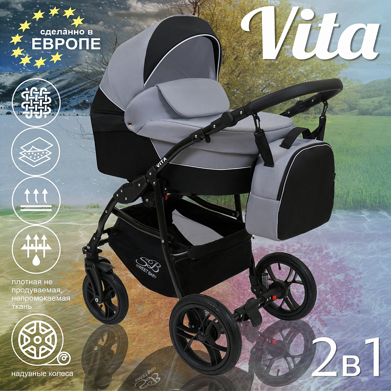 Универсальная коляска для новорожденных 2в1 Sweet Baby Vita - обеспечивает максимальный комфорт во время прогулок. Коляска создана для малышей с рождения и до 3-х лет. Большие надувные колеса с протекторами и мягкой амортизацией, позволяют коляске легко передвигаться по разным рельефам и без труда преодолевать препятствия (сугробы, грязь, бордюры). Просторная, эргономичная люлька для обеспечения максимального комфорта с первых месяцев жизни. Специальное окно в капюшоне для правильной циркуляции воздуха и температуры внутри. Увеличенный капюшон с козырьком защитит новорожденного от ветра и солнца. Реверсивный прогулочный блок устанавливает на шасси, как по ходу движения, так и лицом к родителям. Регулируемый наклон спинки и подножки позволит подобрать максимально удобное положение для малыша. Увеличенный капор выполнен из защитной и непромокаемой ткани (UPF50+) и оснащен дополнительным солнцезащитным козырьком. Накидка для ножек станет дополнительной защитой во время прогулок в межсезонье.