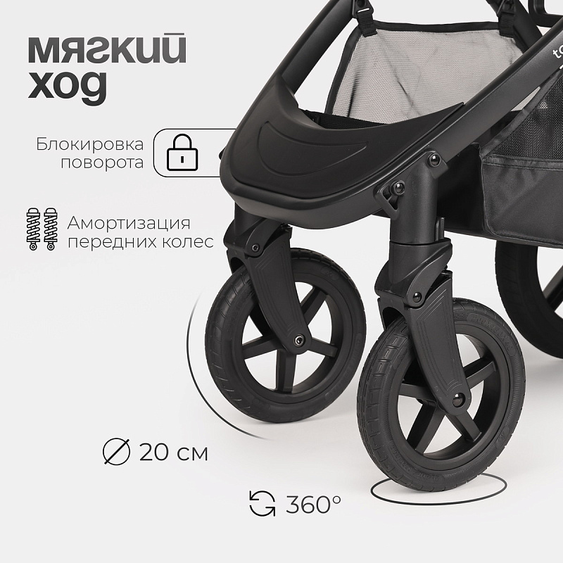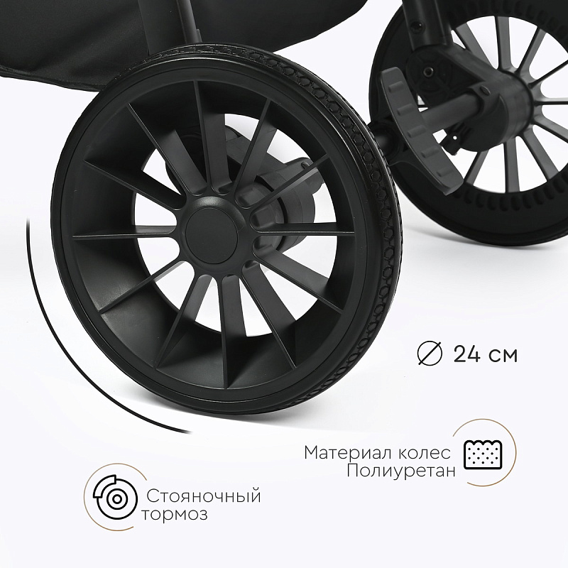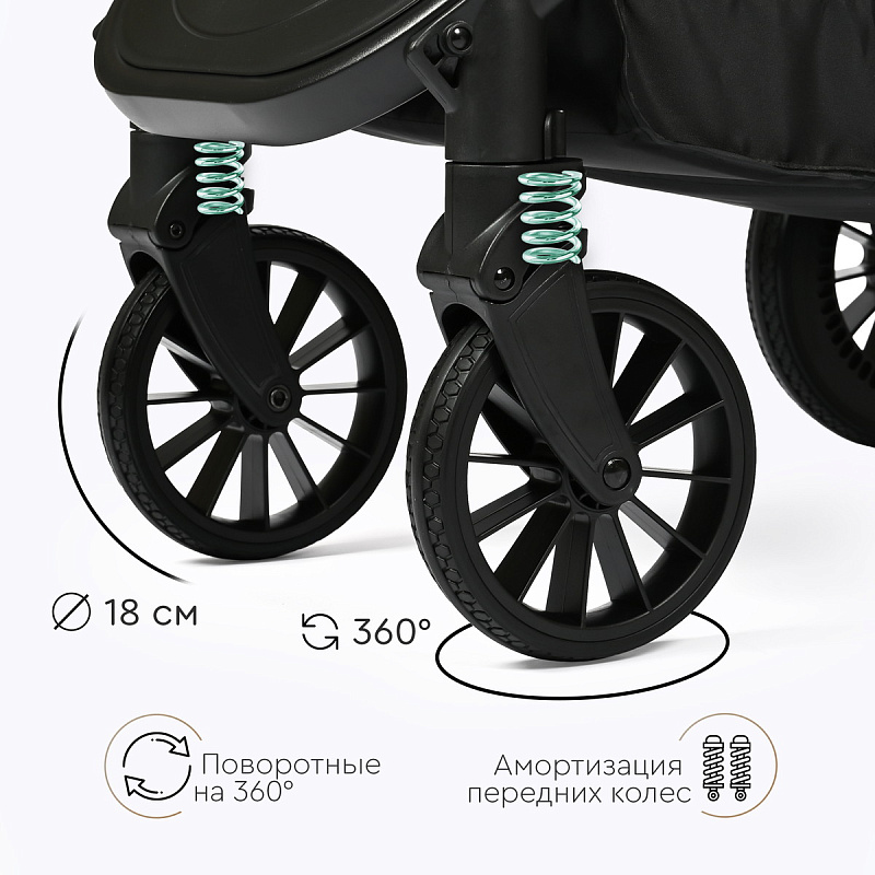 Колеса выполнены из PU материала, диаметр — 18 см (передние) и 24 см (задние). Передние поворотные колеса оснащены амортизацией для плавного движения, а также имеют возможность фиксации.