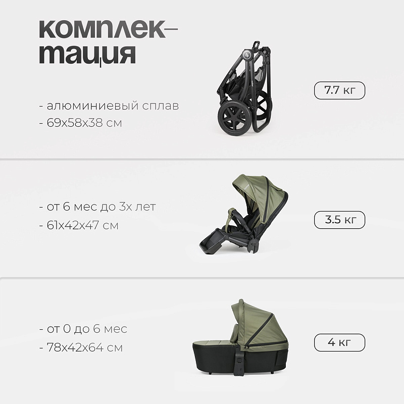 Легкая и прочная алюминиевая рама гарантирует, что вы сможете без труда управлять коляской на любой местности. Она оснащена модульной системой, включающей в себя люльку и прогулочный блок, которые легко устанавливаются и снимаются по мере роста ребенка. Регулируемая ручка подстраивается под любой рост родителей!