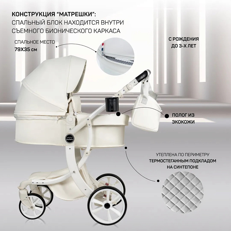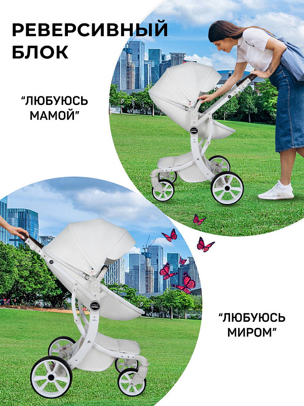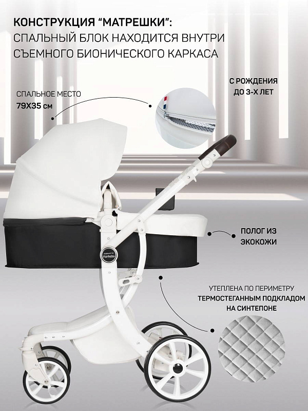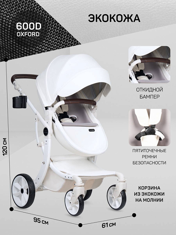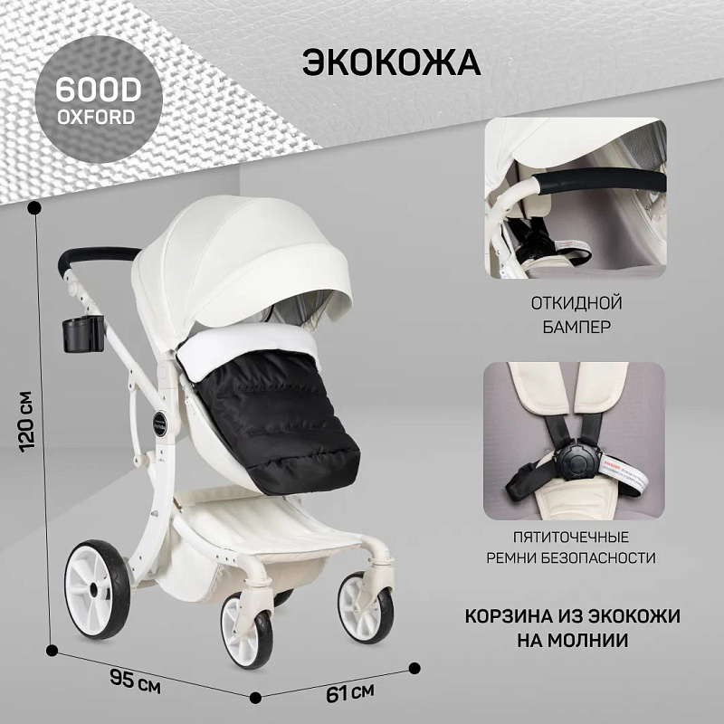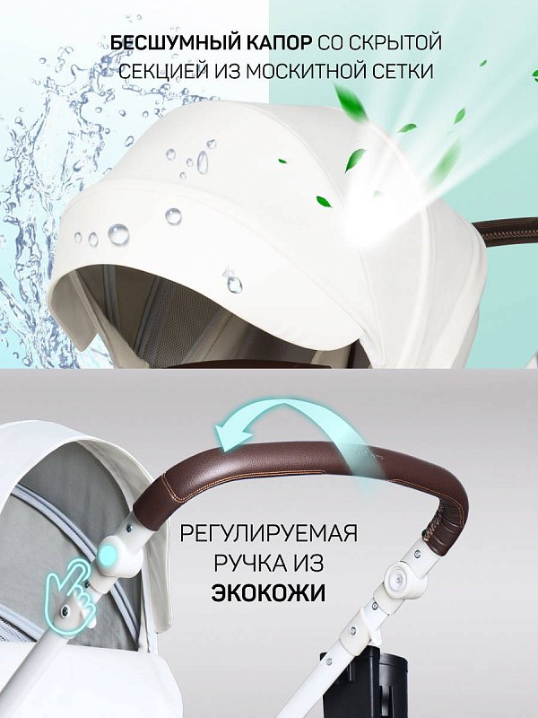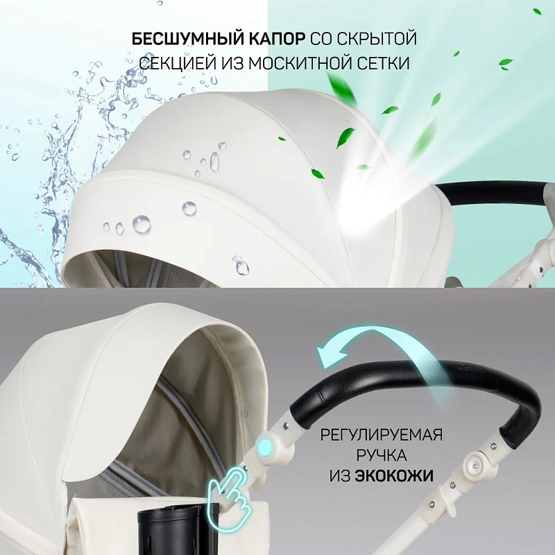 1. Коляска-трансформер Aimile PRO подходит для использования круглый год. Капюшон и полог для люльки выполнены из экокожи, что делает уход за ними очень простым - достаточно протереть влажной салфеткой.