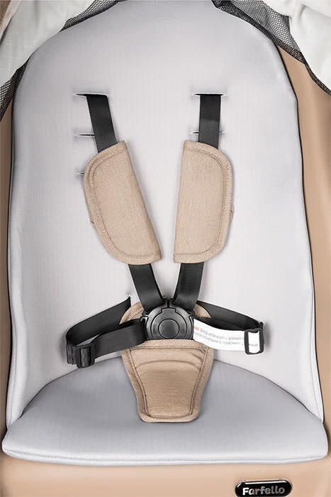 8. Безопасность во время движения обеспечивают регулирующиеся по высоте пятиточечные ремни безопасности, а также бампер, который отстегивается с любой стороны для быстрого размещения ребенка в коляске.