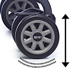- Сдвоенные колеса из высокопрочной резины, поворотные передние пары (с опцией фиксации), облегченное шасси, ножной тормоз делают Easywalker Mini маневренной и послушной в управлении.