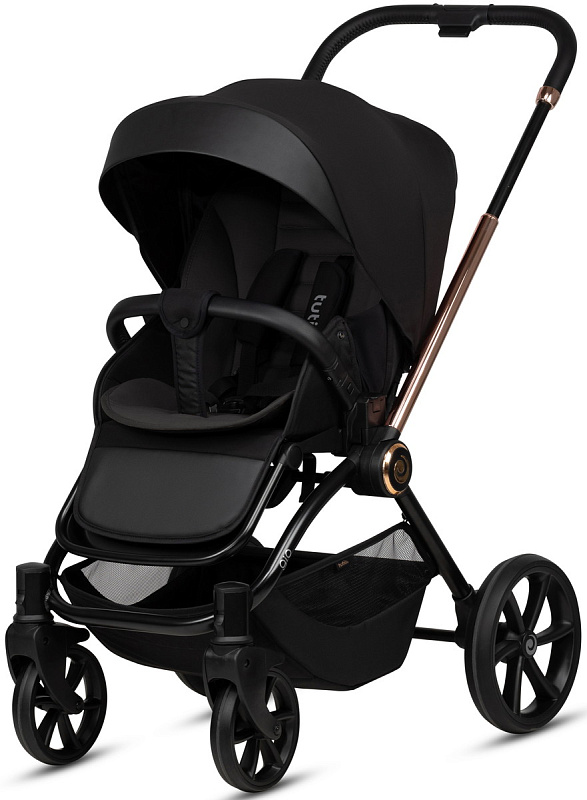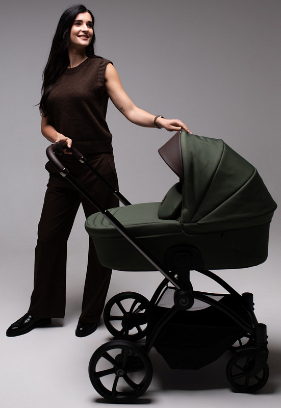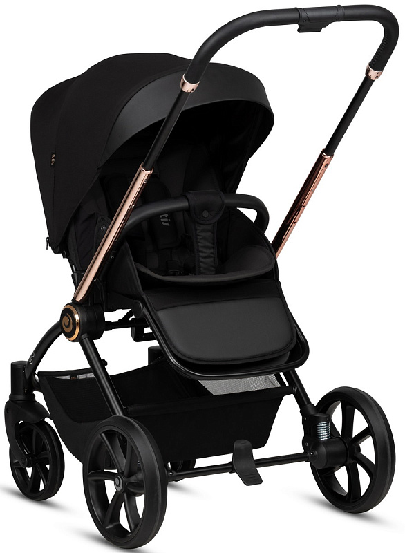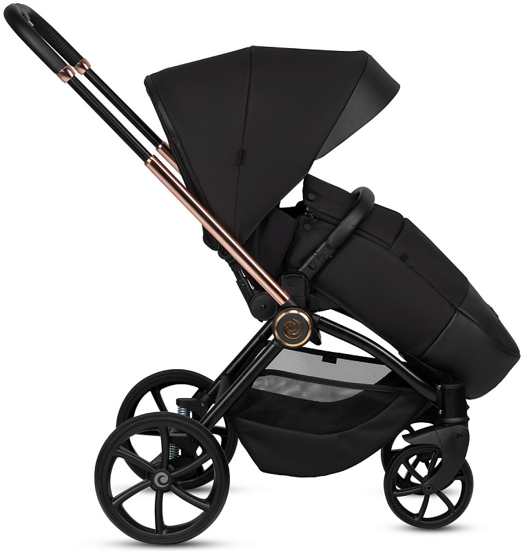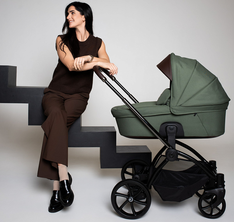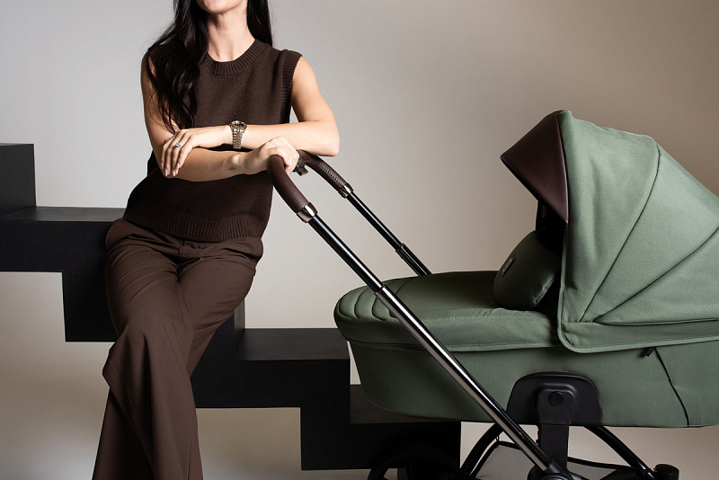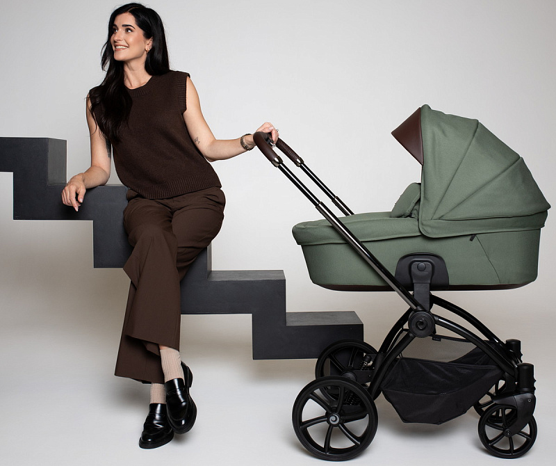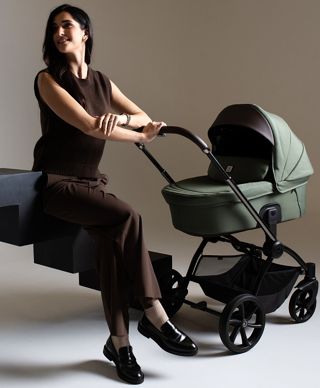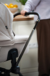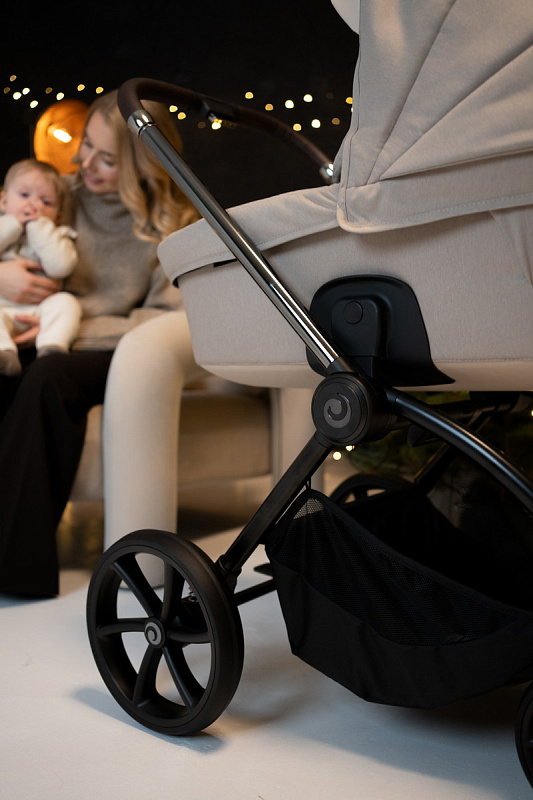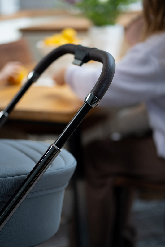 Ручка коляски покрыта мягкой экокожей и регулируется телескопически, чтобы подстроиться под разный рост родителей. Тормозная система выполнена в виде двусторонней педали, которая не пачкает вашу обувь. Вместительная корзина для покупок с сетчатыми бортиками легко доступна независимо от положения спинки сиденья.