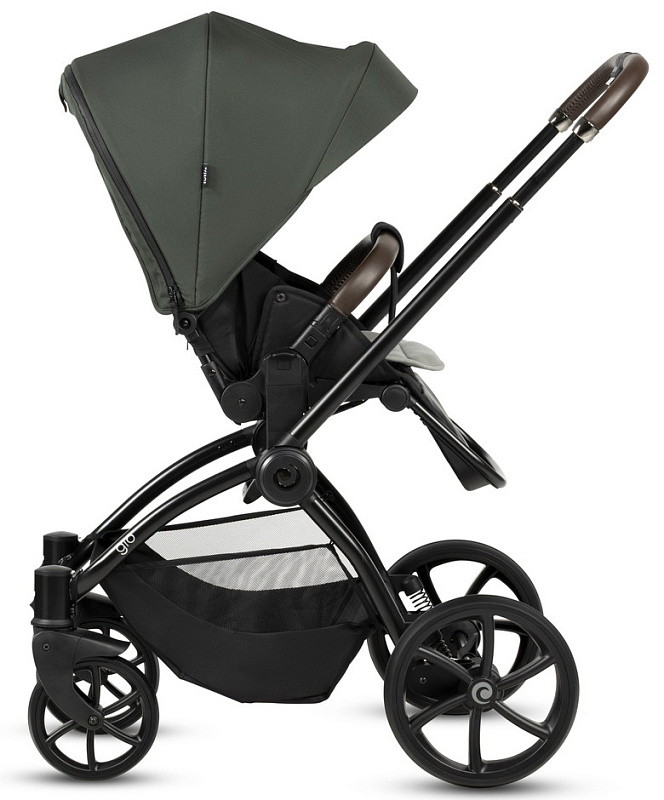 Ручка коляски покрыта мягкой экокожей и регулируется телескопически, чтобы подстроиться под разный рост родителей. Тормозная система выполнена в виде двусторонней педали, которая не пачкает вашу обувь. Вместительная корзина для покупок с сетчатыми бортиками легко доступна независимо от положения спинки сиденья.