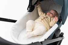 Глубокий капюшон укроет от солнца и непогоды. Большая сетчатая секция удлиняет капюшон и обеспечивает вентиляцию в жаркие дни.