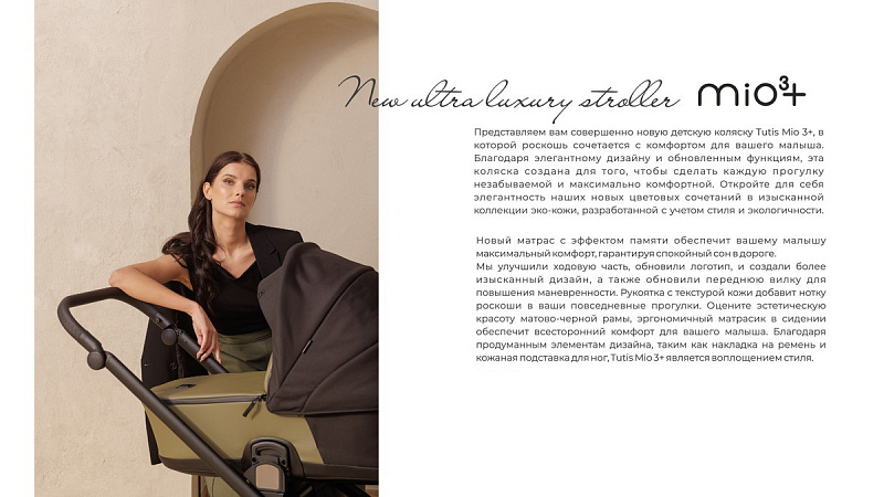 Представляем вам совершенно новую детскую коляску Tutis Mio 3+, в которой роскошь сочетается с комфортом для вашего малыша, Благодаря элегантному дизайну и обновленным функциям, эта коляска создана для того, чтобы сделать каждую прогулку незабываемой и максимально комфортной.