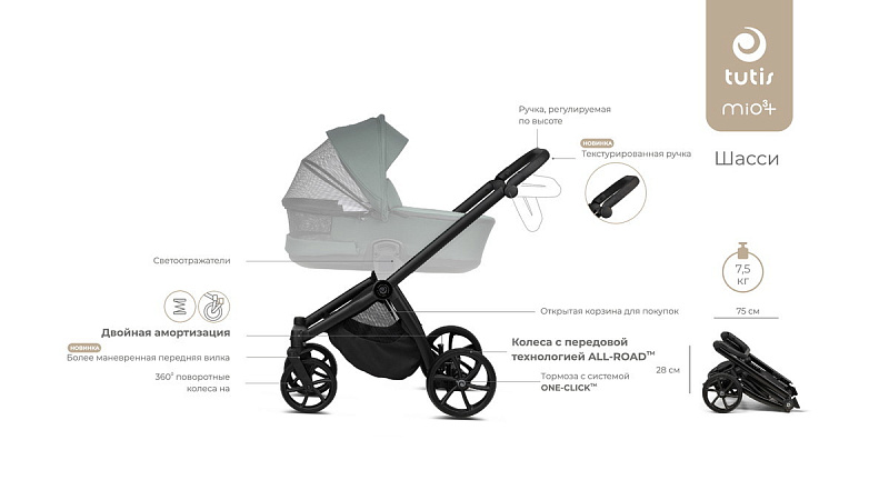 Представляем вам совершенно новую детскую коляску Tutis Mio 3+, в которой роскошь сочетается с комфортом для вашего малыша. Благодаря элегантному дизайну и обновленным функциям, эта коляска создана для того, чтобы сделать каждую прогулку незабываемой и максимально комфортной.