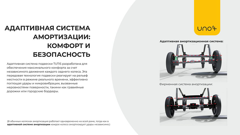 Фирменная система амортизации: (В обычных колясках амортизация работает одновременно на всей раме, тогда как в адаптивной системе амортизации каждое колесо амортизирует удары независимо.)