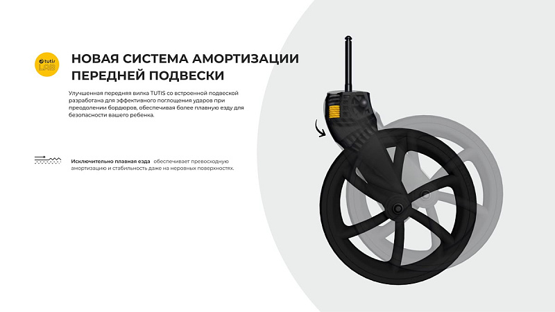 Улучшенная передняя вилка TUTIS со встроенной подвеской разработана для эффективного поглощения ударов при преодолении бордюров, обеспечивая более плавную и безопасную езду для вашего ребенка.