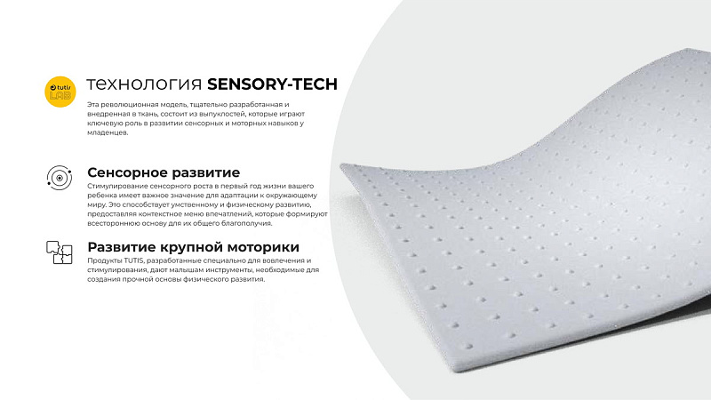 Эта революционная разработка, искусно интегрированная в ткань, представляет собой выпуклые элементы, играющие ключевую роль в развитии сенсорных и моторных навыков малышей.