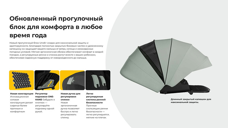 Новый прогулочный блок UNO6+ создан для максимальной защиты и адаптивности. Благодаря полностью закрытым боковым частям и удлиненному капюшону он защищает вашего малыша от ветра, солнца и капризов погоды. Мягкая эргономичная обивка обеспечивает комфорт в каждой поездке, а регулируемые ремни и спинка растут вместе с вашим ребенком, обеспечивая надежную поддержку от новорожденного до подросшего малыша.