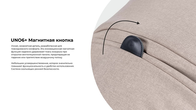 UNO6+ Магнитная кнопка – умная, незаметная деталь, созданная для повседневного комфорта. Эта инновационная магнитная функция надежно фиксирует ткань козырька при открытии вентиляционной панели, предотвращая её падение или создание помех для циркуляции воздуха. Незначительное усовершенствование, которое в разы повышает функциональность и удобство в использовании. Система скользящих ремней безопасности.