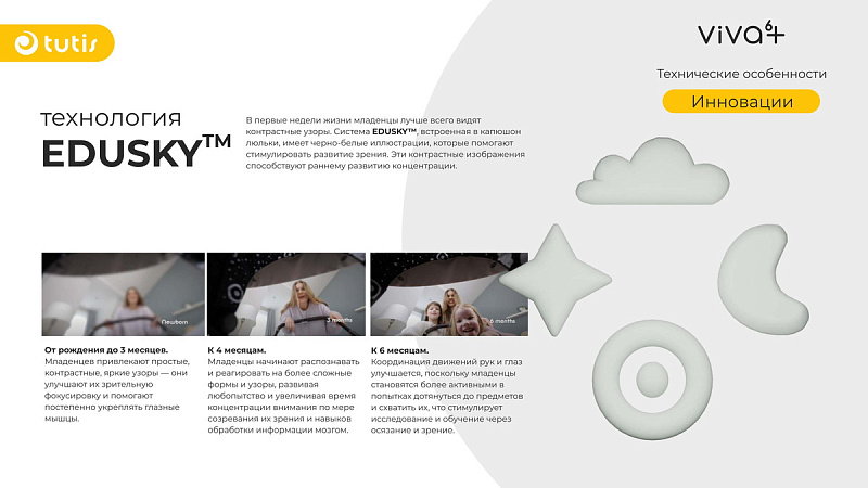 Благодаря EDUSKY™, иллюстрациям на капоре, специально разработанными для раннего развития зрения, и деталям SENSORY-TECH, которые стимулируют моторные навыки, Viva6+ становится больше, чем просто коляской, — она становится частью мира открытий вашего ребенка.