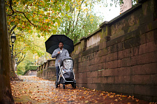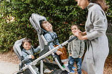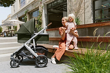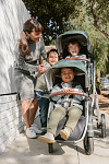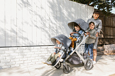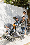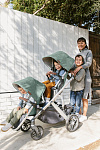 Благодаря мягким шинам и новой пружинной амортизации на всех колесах коляска сохраняет плавный ход во время прогулок независимо от дорожного покрытия и количества детей внутри.