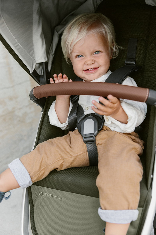 Ручка регулируется по высоте для удобства использования родителями любого роста. Накладка на ручку выполнена из высококачественной натуральной кожи, поэтому обеспечивает надежный хват и легкий уход.