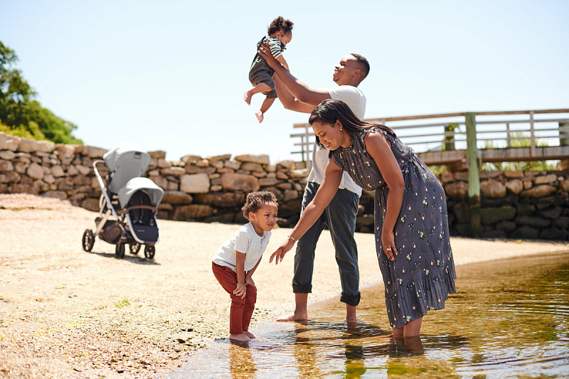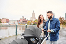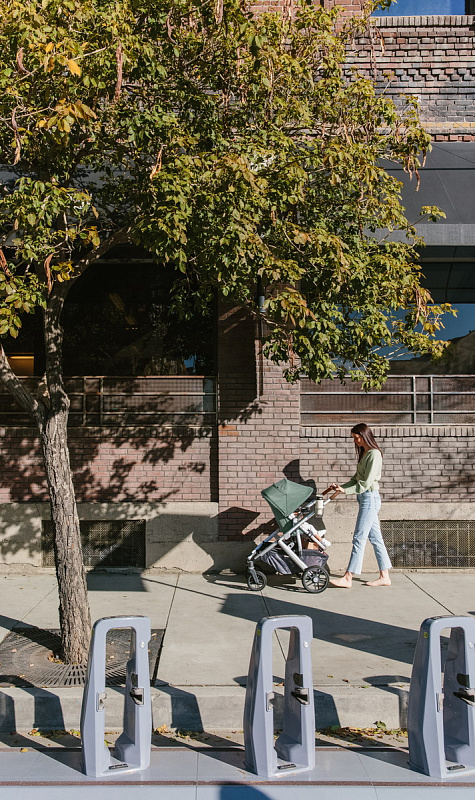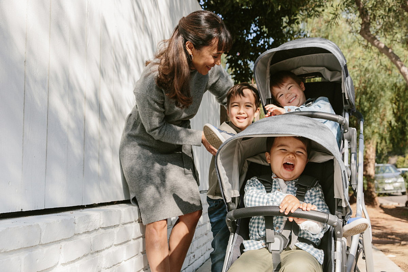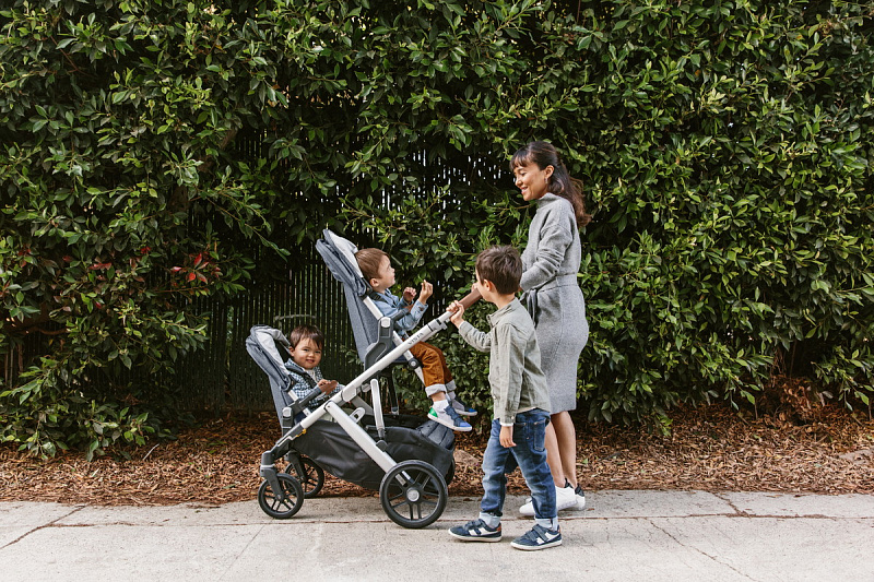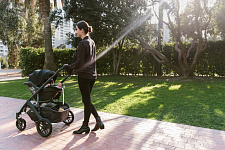 Благодаря мягким шинам и новой пружинной амортизации на всех колесах коляска сохраняет плавный ход во время прогулок независимо от дорожного покрытия и количества детей внутри.