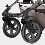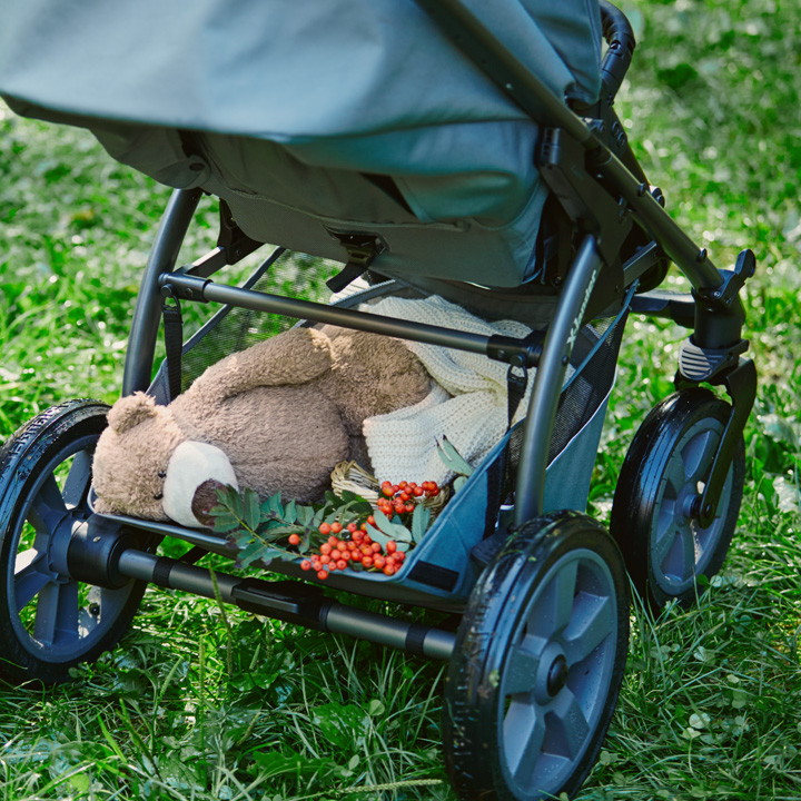 - Наличие передних свободно вращающихся колес с функцией фиксации позволяет легко управлять транспортом - телескопическая ручка регулируется под рост родителей, а сама коляска может без труда развернуться на весьма ограниченной площади.