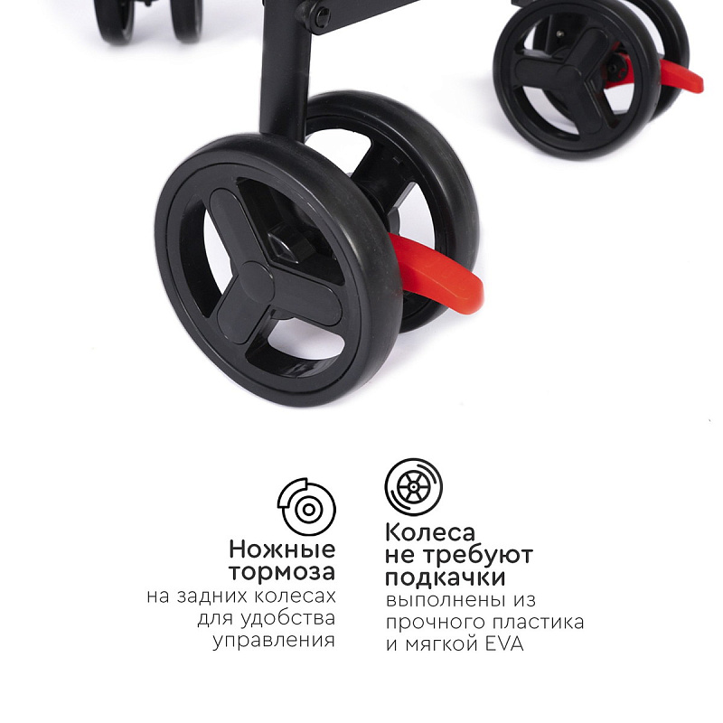 - Передние поворотные колеса на 360 градусов с фиксатором для движения по прямой