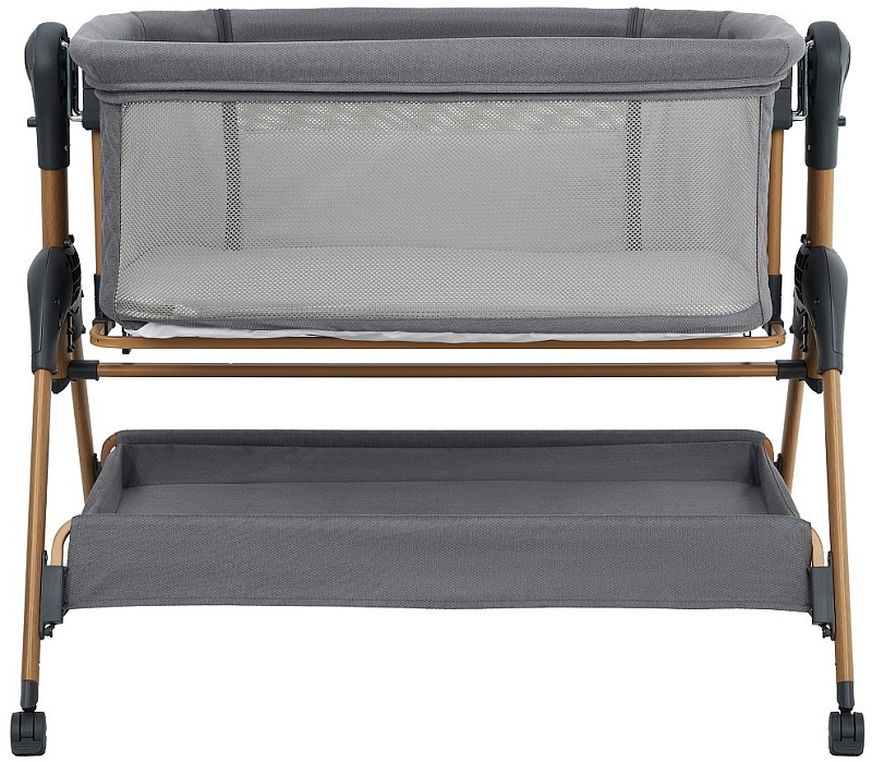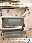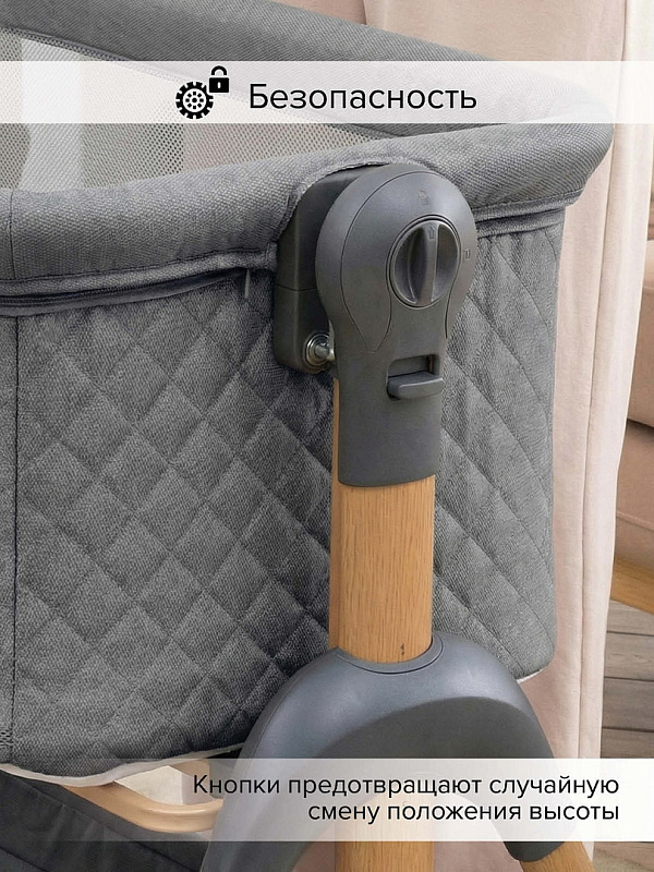 Всегда рядом: Специальная система крепления (ремни) позволяет быстро приставить колыбель вплотную к вашей кровати. Боковой бортик опускается на молнии, создавая единое пространство.