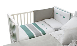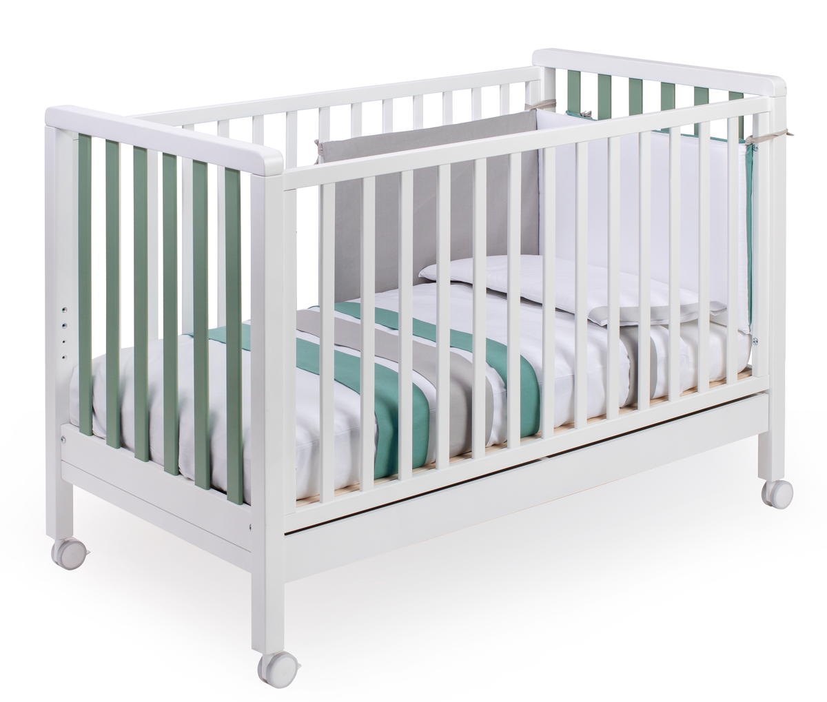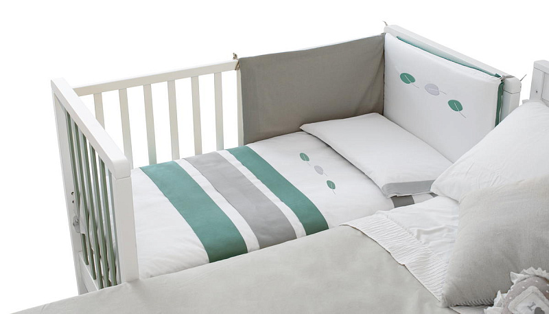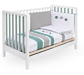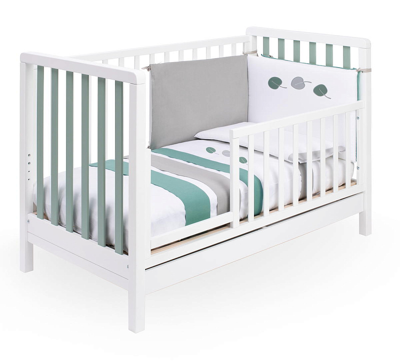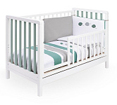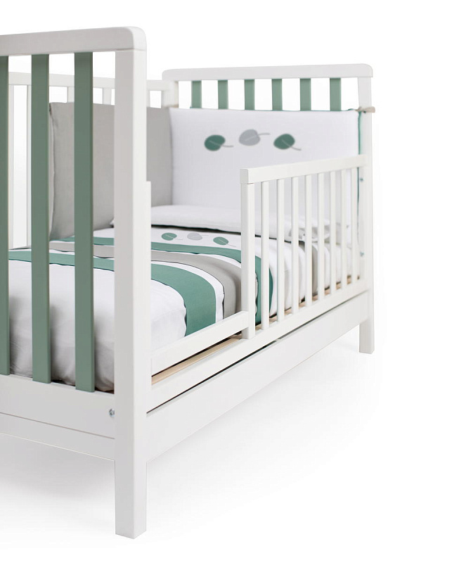 Кроватку дополняет удобная подматрасничная сетка из необработанного букового дерева. Четыре вращающиеся колеса, два из которых оборудованы блокирующим тормозом, делают перемещение кроватки максимально удобным. Кроватка также оснащена выдвижным ящиком для хранения белья, разделенным на две секции и выполненным из ламинированных панелей. Стоит отметить, что матрас в комплект поставки кроватки не входит.