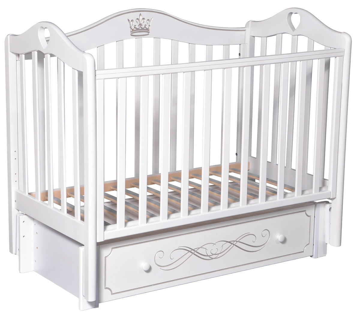 Детская кроватка с фигурной задней стенкой и универсальным маятниковым механизмом. По желанию можно установить поперечный или продольный маятник. Родители по достоинству оценят качество и комфорт системы, ее удобство и практичность. Мебель производится в соответствии с европейскими стандартами качества из экологичных и безопасных для ребенка материалов: массива березы. У основания есть вместительный ящик закрытого типа на роликовых направляющих, который отлично подходит для хранения сменного детского постельного белья или игрушек.