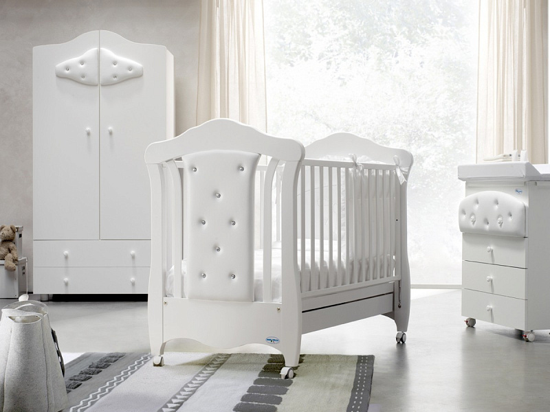 - Помимо плавных полозьев для качания, Baby Italia Mimi Pelle снабжена прорезиненными колесиками со стопором, которые позволяют сделать перемещение кроватки по комнате простым и бесшумным.