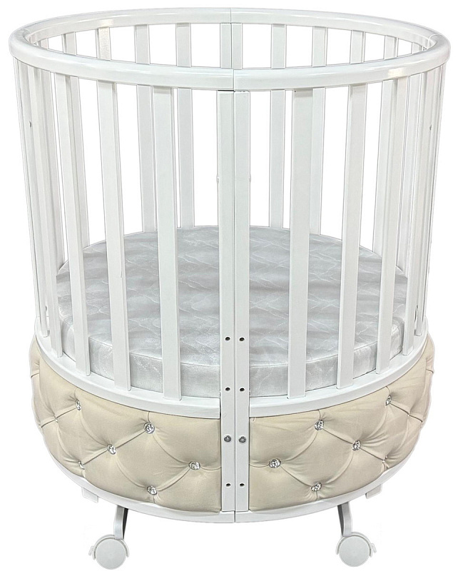 Детская кроватка дополнена универсальным маятником, продольным или поперечным, имеется фиксатор. Из модели можно собрать круглую кроватку, овальную кроватку, манеж, 2 стульчика, столик и диванчик.