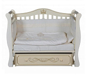 Детская кроватка с универсальным маятником, продольным или поперечным, имеется фиксатор. Задняя стенка фигурного типа украшена декоративной резьбой.