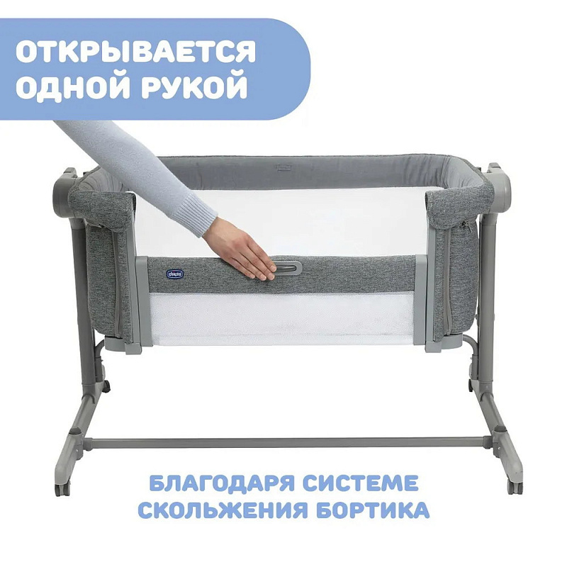 При опущенной боковой стенке кроватка используется как приставная. Открыть или закрыть бортик легко одной рукой, нажатием на удобную кнопку и благодаря новому скользящему механизму. С закрытой боковой панелью кроватка используется как традиционная отдельно стоящая детская кровать.