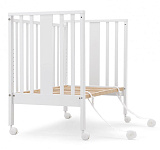 Кроватка оснащена четырьмя поворотными колесиками с резиновыми накладками, два из которых имеют тормоза для большей устойчивости. Подматрасник выполнен в виде ортопедической сетки из неокрашенного бука, что способствует хорошей вентиляции. Любая из боковых спинок может быть полностью снята, что добавляет удобства в использовании.
