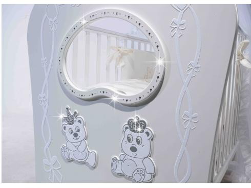 - Объемная аппликация в виде двух милых медвежат, красивый орнамент и сияющие кристаллы делают кроватку просто сказочно красивой.